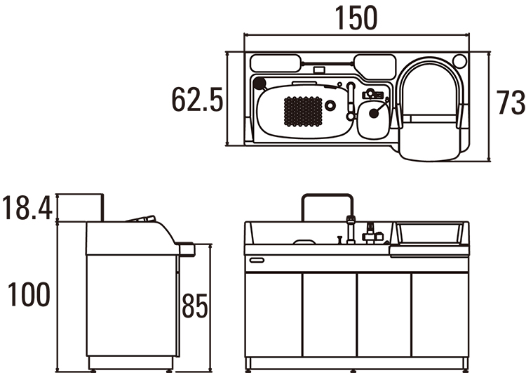 ●構成: 沐浴槽・ミニシンク・おむつ交換台・サーモスタット付水栓・シャワーホース・小物置き・タオルハンガー