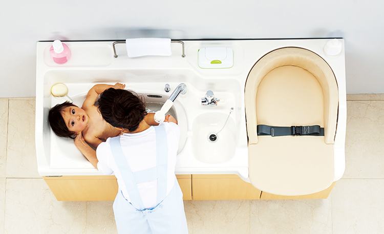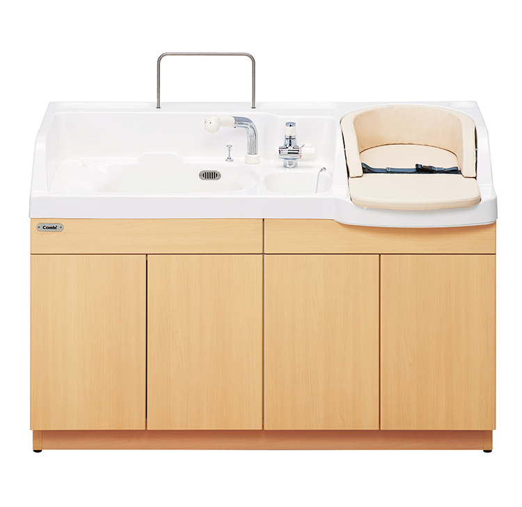 首のすわらない乳児からお座りのできる乳幼児までサーモスタット付温水シャワーで汗を流すことや、お湯を入れて入浴ができる浴槽です。
