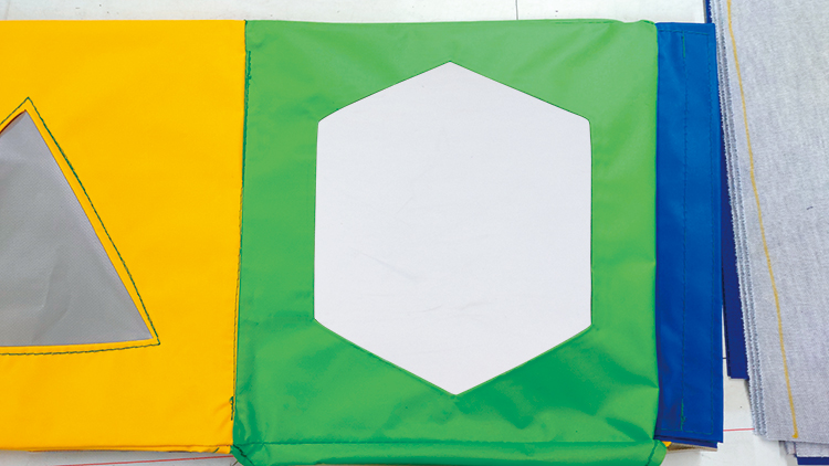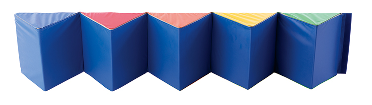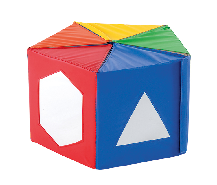側面に、三角形・四角形・六角形の鏡が付いているベンチです。ベンチを広げると、三角柱が連なったマットになります。