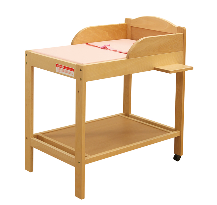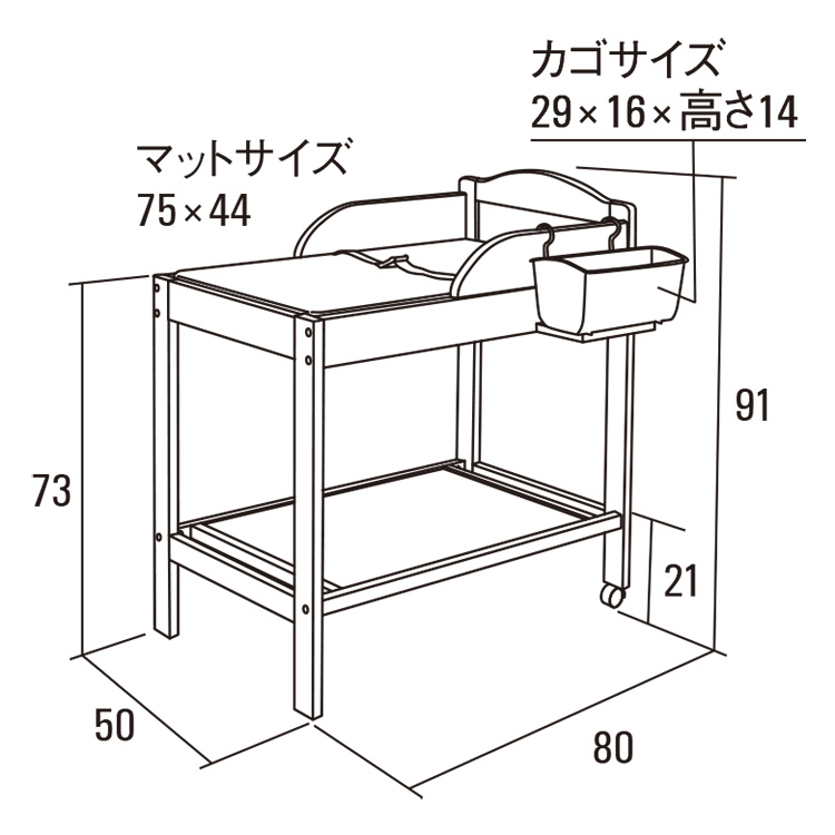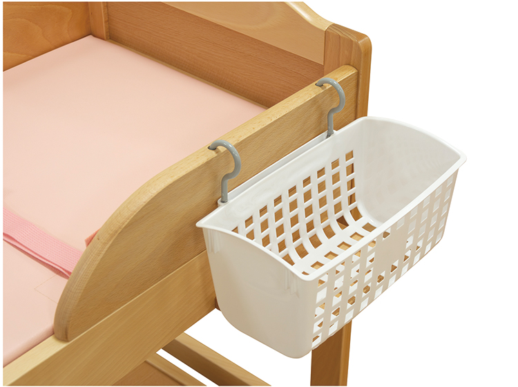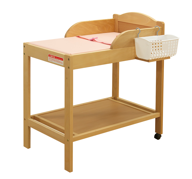 左右どちらにも収納カゴがつけられます。キャスター付で移動も楽にできます。おむつなどの保管ができる棚付です。壁に固定できる金具付(現地取り付け)。
