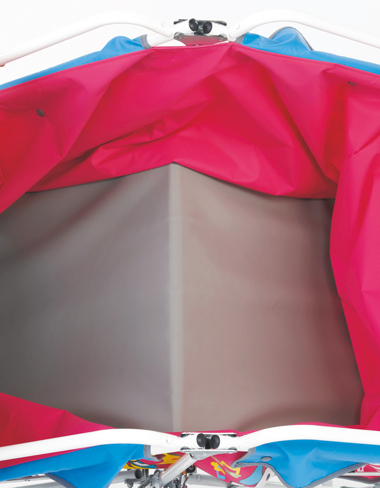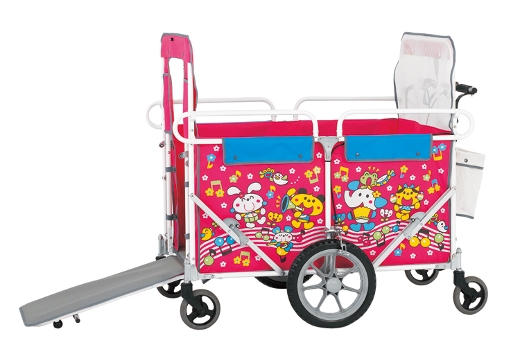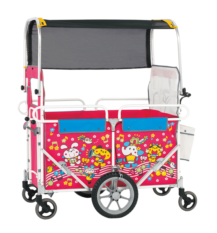 にぎやかなかわいいデザインのお散歩兼用避難車です。ノーパンクタイヤ、防炎シート採用