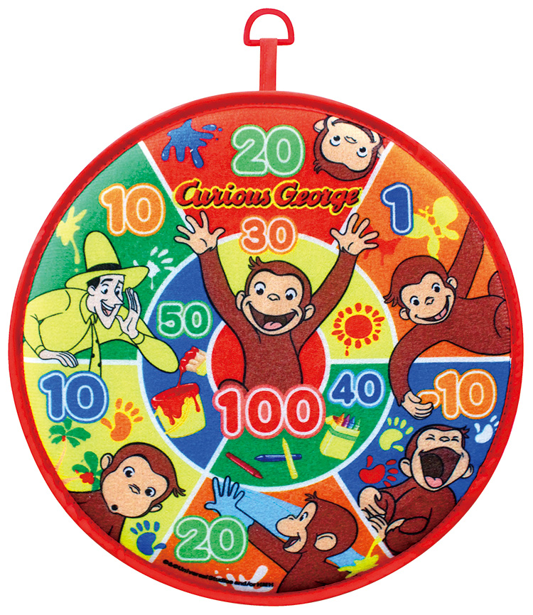 おさるのジョージのかわいいダーツです。面ファスナー付のボールを点数が書いてある的に投げて遊びます。中が空気のボールを使用しているので幼児でも安心です。