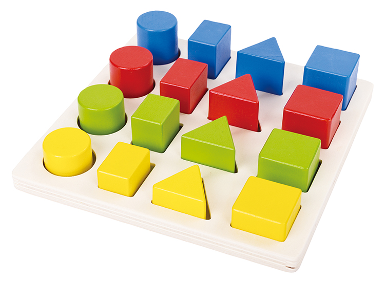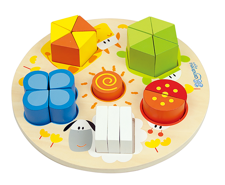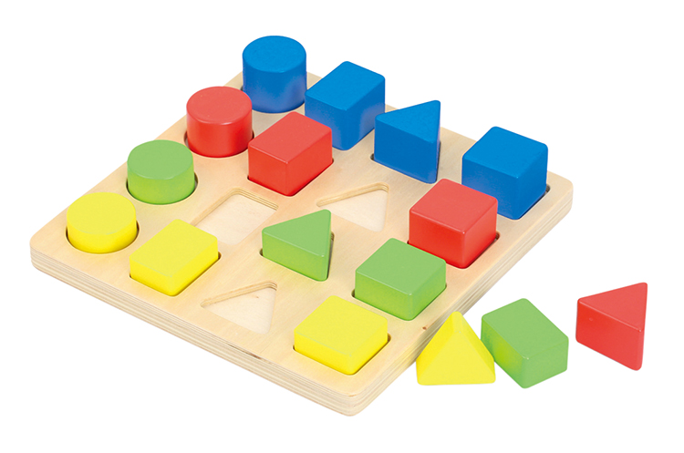 基本図形のはめこみパズル16ピースと21ピースの2種セット。大きさ比べ、仲間集めとしても遊べます。