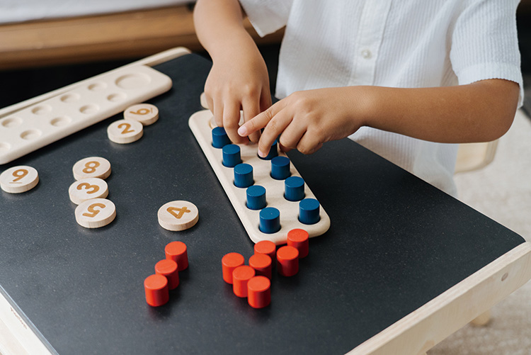 算数教育の基礎を視覚で学べる教材です。感覚教育としてはまず、教具をつまんで・並べて・積んで・数えてみて、量的に多い・少ないことを実際に見て経験することができます。また、ペグの個数と数字が一致するようになるという、あたまの育ちを促します。その後、赤が6個・青が4個で10になるということを知り、「どちらがいくつ多いか」「少ないか」がわかるようになります。1~20の数を使って基本的な足し算、引き算、掛け算、割り算の基礎を学びます。