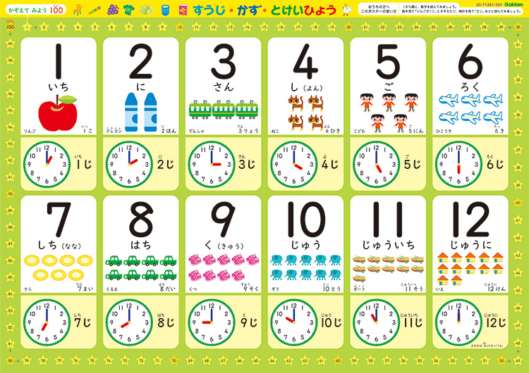 1~20までの数カード、数字カードと、12枚の時計カードです。数と数字を合わせるゲームや数の大きさを比べて遊んだり、時計に親しんだりすることができます。