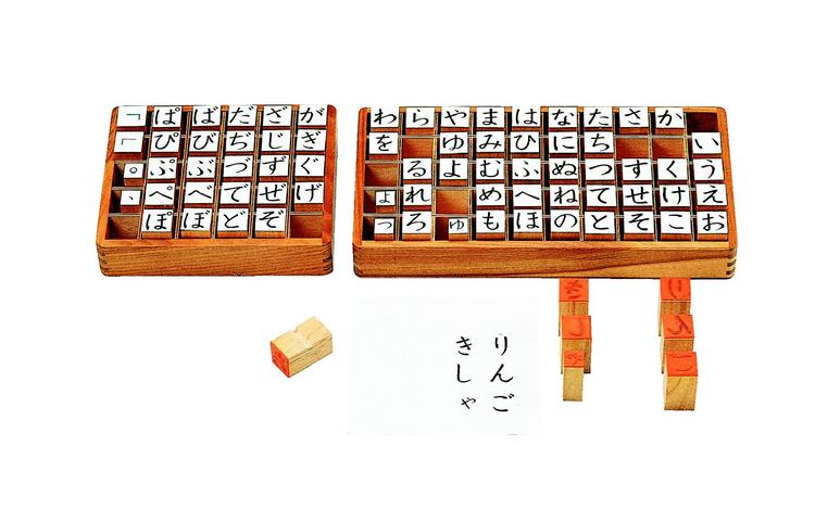 文字カードよりも、より書くことを身近に感じさせる練習ができます。文字の拾い読みはできても、まだ上手に文字が書けない時期に最適です。自分の名まえの各文字のゴム印を探して、言葉を作ったりします。