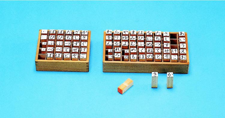 『ひらがなゴム印(大)』と同じ内容で、ゴム印の大きさだけが異なります。言葉・文章作りのほかに、絵カードや資料を作るのにも使えます。