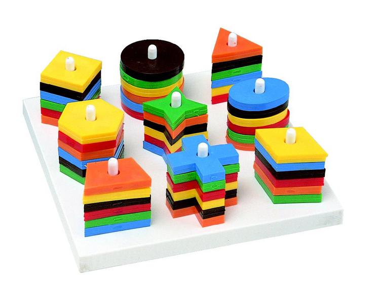 9本の棒が立っている台に型板を差して、分けたり集めたりする教具です。
