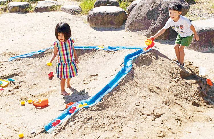 砂場で水を流して遊べるレールのセットです。側面に水の波紋がついた、涼やかなクリアカラー仕様です。砂場を広く使って遊ぶことができます。ストレートタイプとコーナータイプをつなげることで長い水路も作ることができます。