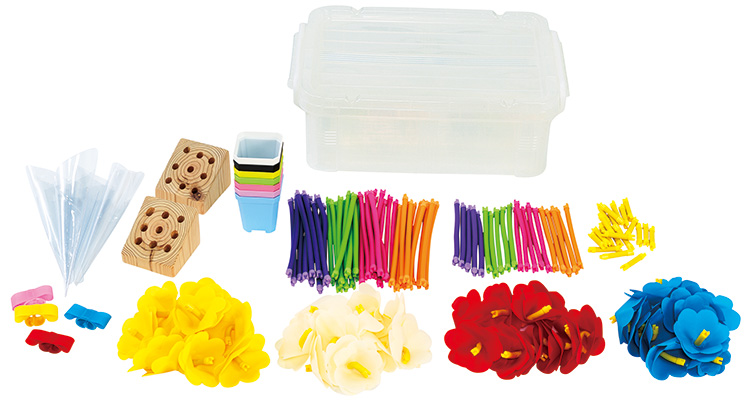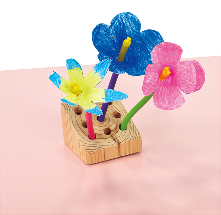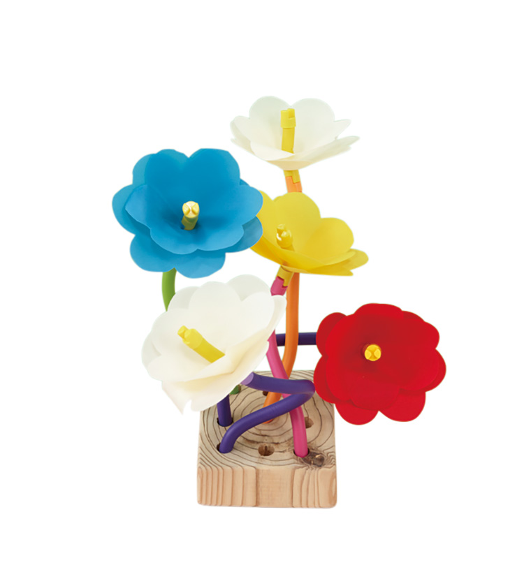 お花と茎の組み合わせでコーディネイトを楽しめるセットです。植木鉢やフラワーベースで作品作りをしたり、ラッピングをしたりして楽しめます。遊び方ガイドとお花の型紙付。