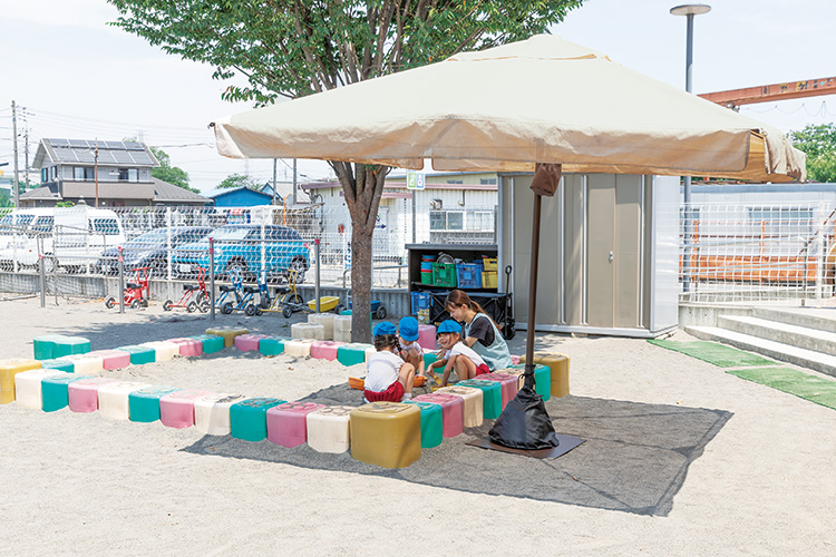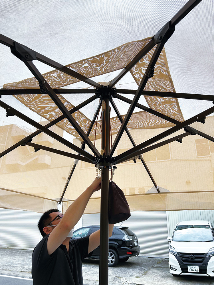 本体(天幕と軸フレーム)の軽量化をはかり、台座には杭が打てるための杭穴を加工。設営が簡易に行えるパラソルです。