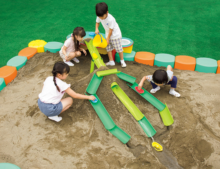 砂場で水を流して遊べるレールのセットです。付属の収納袋の底面は、水や砂が抜けやすいメッシュ仕様です。