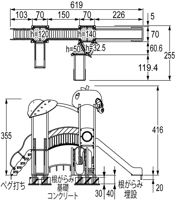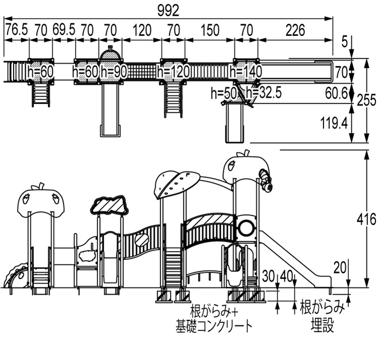 ●構成遊具:ミニ=凹凸スロープ・階段・トンネル・滑り台・見張り台