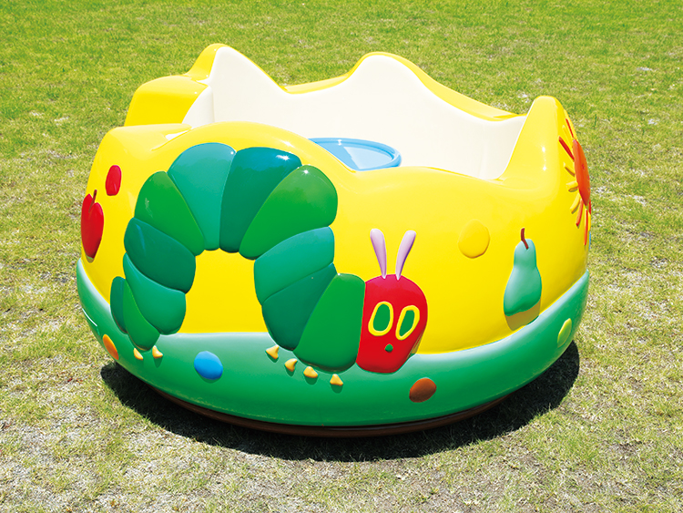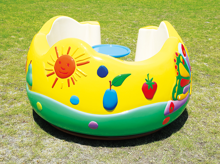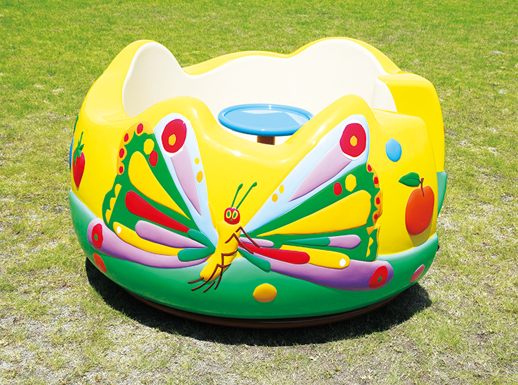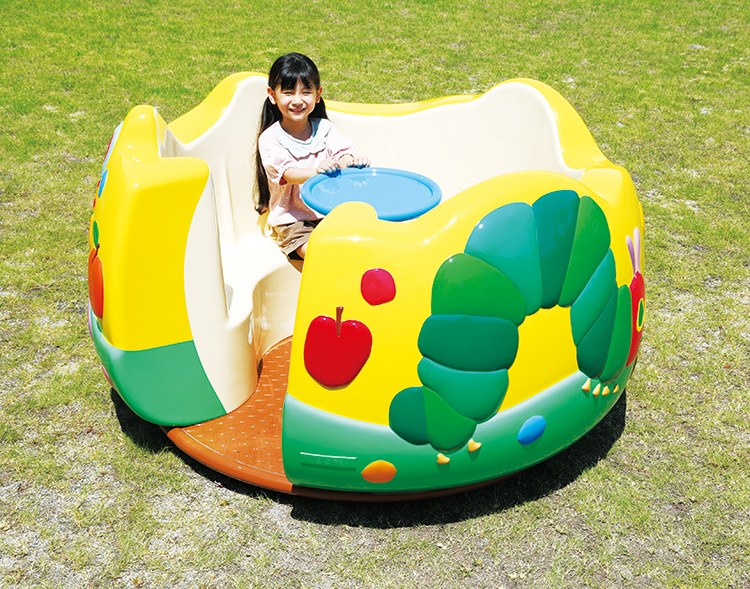 新機構・新設計で安心して遊べるはらぺこあおむしの回転遊具です。土台を保護カバーで覆い、車軸が故障して回転体が傾いたときはブレーキがかかるようになっています。