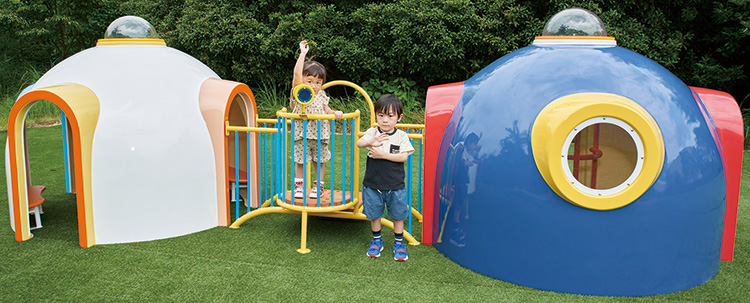 半円形ドームでできたFRP遊具です。直接つなげたり、運動遊具の付いた橋で接続したりして、遊びを広げられます。また、ドームの中に机やベンチを置くことができ、天井の窓から周囲をのぞけるようなリング登りもオプションで付けられます。隠れ家のようなドームで心を落ち着かせたり、遊具として体の発達につなげたりと、いろいろな使い方が可能です。ドームのカラーバリエーションは4種類あります。