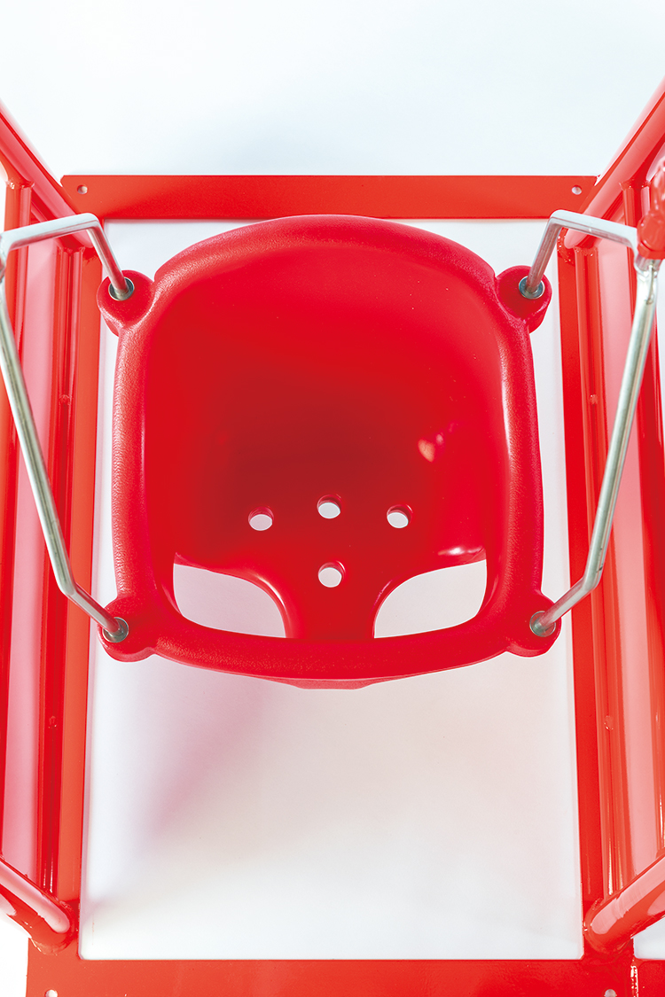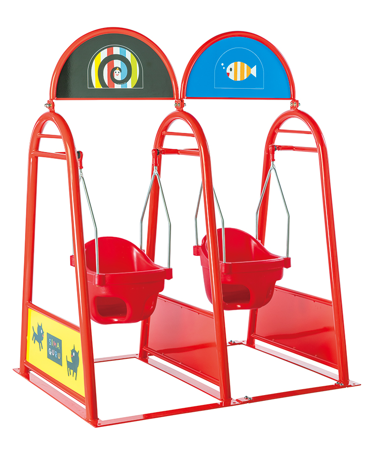 乳幼児にも大人気のしましまぐるぐるがブランコになりました。乳幼児専用ブランコです。保育者が前後にブランコを揺らすことで、乳幼児が楽しく遊べる遊具です。座席が樹脂製のバケット式で前後のスイング時の安全を確保します。吊り金具は、チェーンのようにねじれがない構造で、前後のスイングのみの動きになります。*必ず保育者が付き添って使用してください。