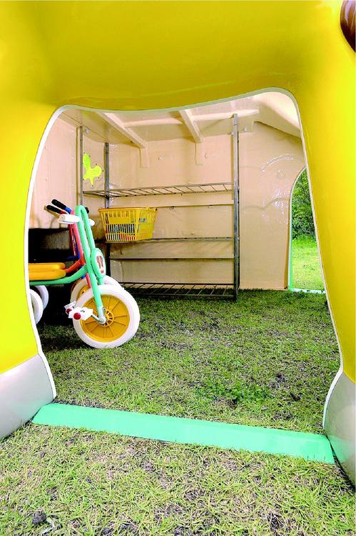 三輪車の収納スペースに早替わりします。別売のステンレス棚を使えば砂場用品もきれいに片付けられます。