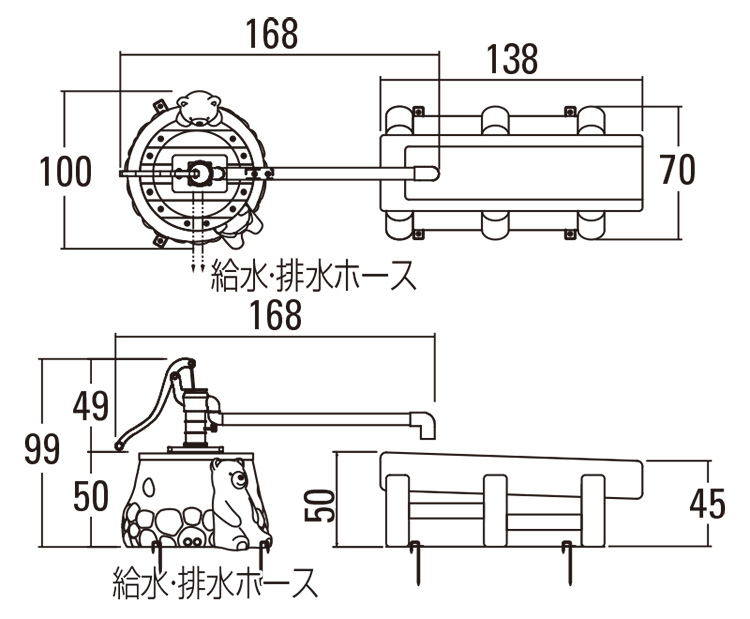 ●材質:本体=FRP パネル=樹脂 板材=木製 ポンプ=鋳物製