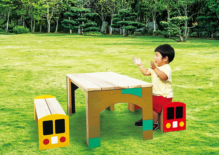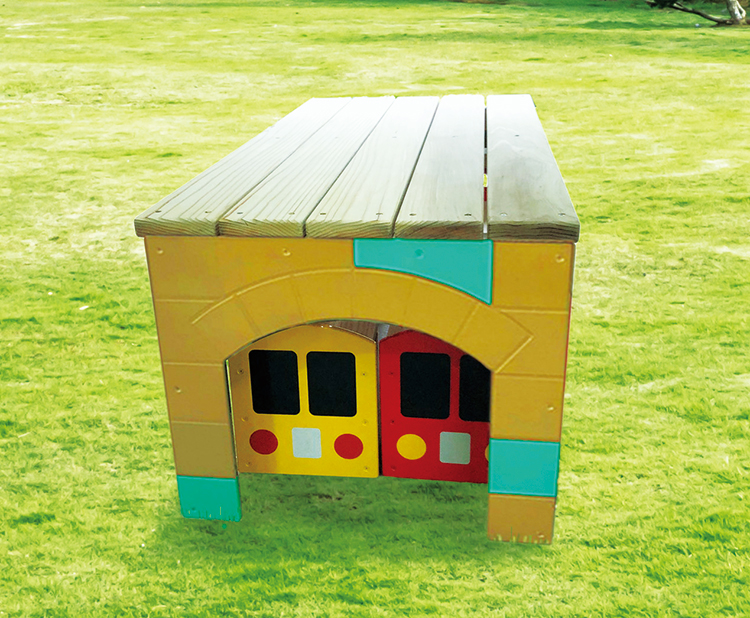ちょっと懐かしい路面電車を今風に再現しました。園庭での子どもたちの休憩場所となる路面電車型のハウスです。憩いの場としても、ごっこ遊びの場としてもご活用いただけます。