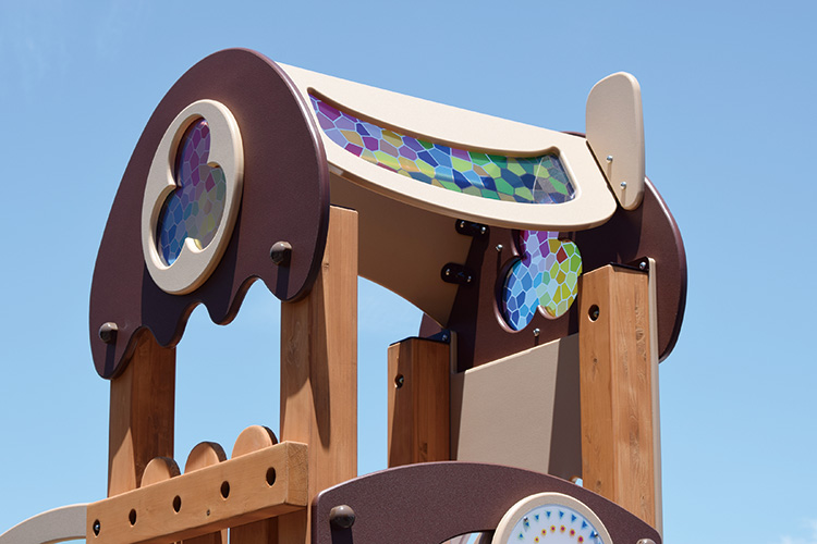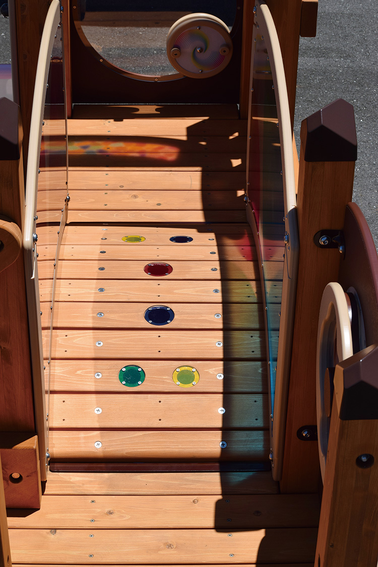 くるくる回すと色が混ざる「カラフルボード」、勢いよく回すと色が混ざって見える「カラフルコマ」、正面から見ると色が重なる「カラフルアーチ」、渡り廊下部は光が差すと地面に色が透過する「カラフルブリッジ」など色が透ける、重なるを楽しむことができます。