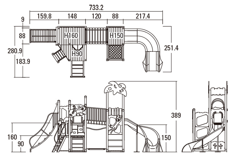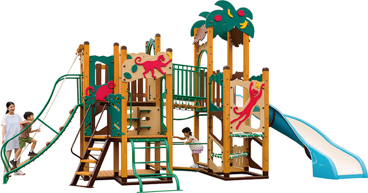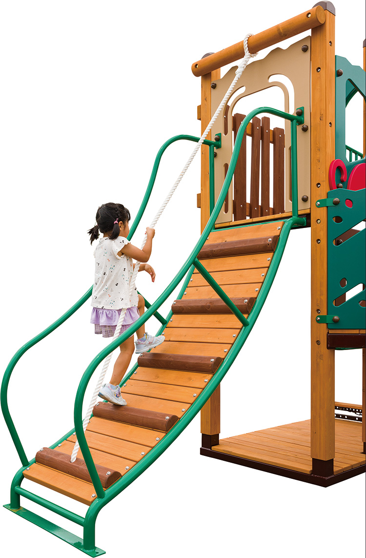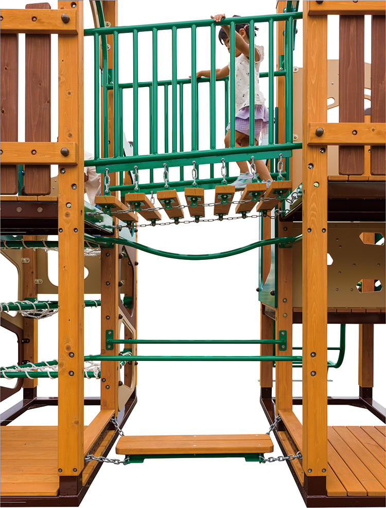 すべり台・階段・吊り橋・アール太鼓橋・アール丸太スロープ・ゆらゆらバランス橋・ネット登り・垂直ステップ登りの8種の遊びを取り入れています。