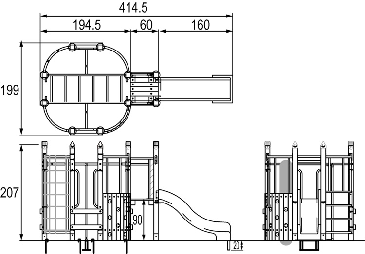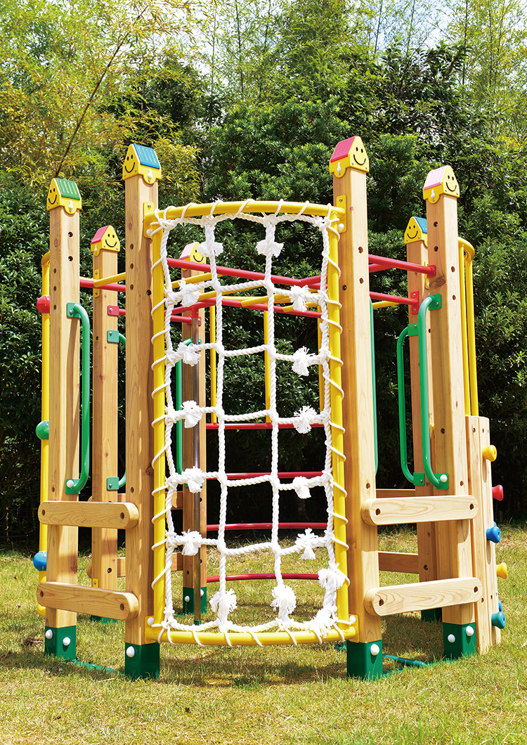 クライミング、ロープ登り、うんていなどさまざまな動きができる運動に特化した遊具です。場所をとらない円柱型。
