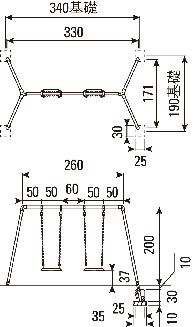 60-71555-100~103の「2人用・4人用ブランコフレーム」には吊り席が付いていませんので「吊り席」を別にご注文ください。