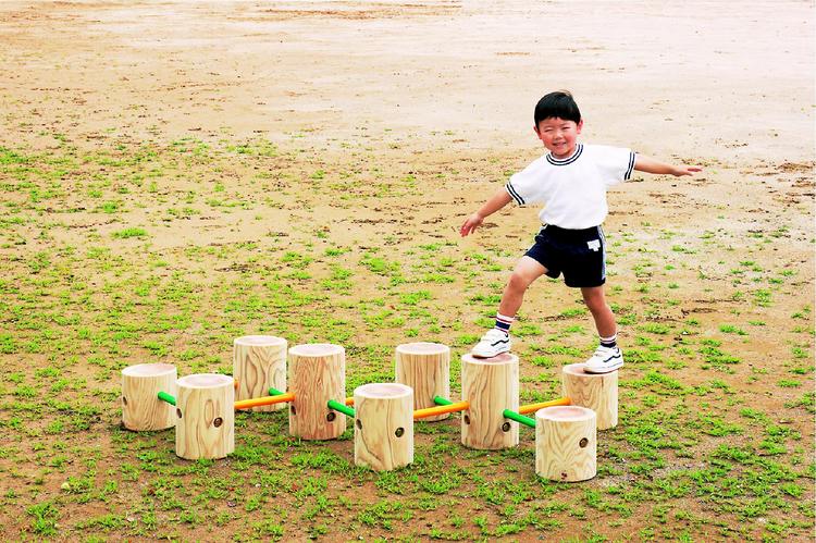 高さの違う丸太の上を渡ります。リズム感・バランス感覚を養います。※アスレチック遊具に使用する木材は自然のものを使っているため、乾燥により割れが生じることがあります。