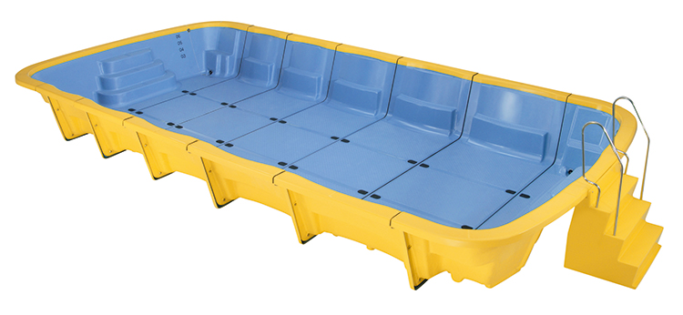 深さが70cmで3.2~7mまでパーツを追加して大きくできる組み立て式プールです。底面、階段面にノンスリップ加工を施して滑りにくくしました。センターパーツの幅を変えてあるので順に重ねると