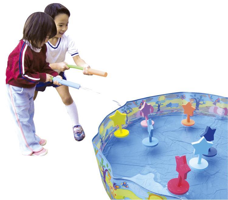 カラフルなスポンジ製の安全な水てっぽうで、プールに浮かべた的を狙います。水流を起こすと的が動き、さらにおもしろくなります。