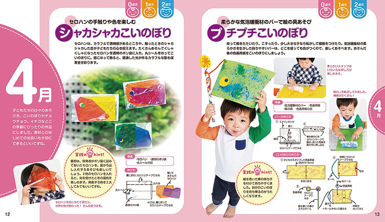 0.1.2歳児が興味をもって楽しめる製作あそび集。発達過程に合わせた作例をたっぷり100案、紹介しています。動植物や食べ物など季節のモチーフから行事をテーマにしたものまで、かわいい作品が作れます。