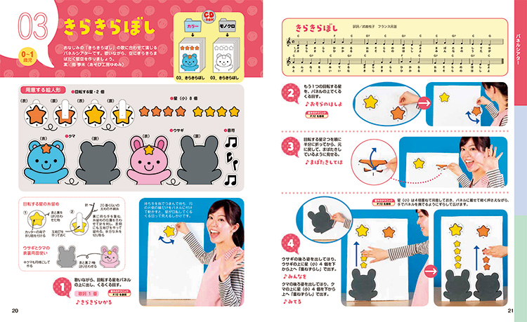「はたらくくるま」「きらきらぼし」「おおきなかぶ」「三匹のこぶた」…0.1.2歳児が楽しめるミニパネルシアター、ペープサートなどをたっぷり28話掲載。かわいい絵人形はすべてCD-ROMにデータ収録されているので、すぐに作って遊べます。