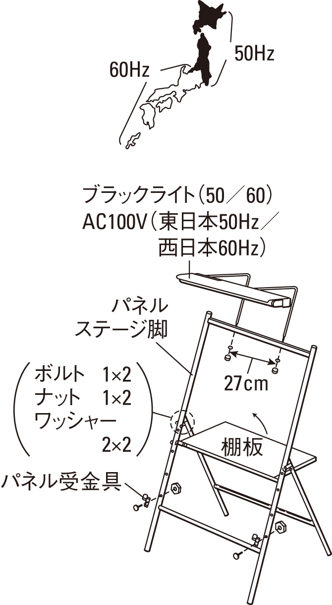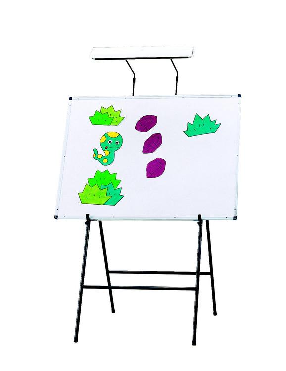 表面が白で裏面が黒の不織布で作られたパネルで、周囲をアルミフレームで囲っています。折りたためる専用脚と棚板がセットになっているので、これさえあれば、どこでもたちまちパネルシアターを演じられます。