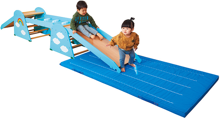 低年齢児向けの巧技台です。クライミングやすべり面などで楽しく身体を動かすのにぴったりです。高さや組み合わせ方で、子どもの成長によって難易度も変えられます。アルコール、次亜塩素酸水で拭いて除菌ができます。