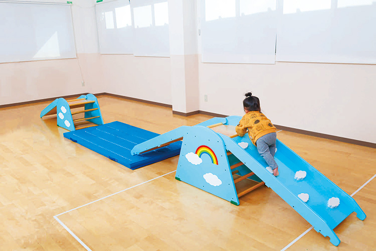 渡りはしごやクライミングに手足の指を掛けて上り下りすることは、手の器用さや足のアーチの形成につながります。また、すべり面は身体をまっすぐに保つ力や平衡感覚のほか、下から登ることで歩くときや走るときに必要な足で蹴る力を養うことができます。 -