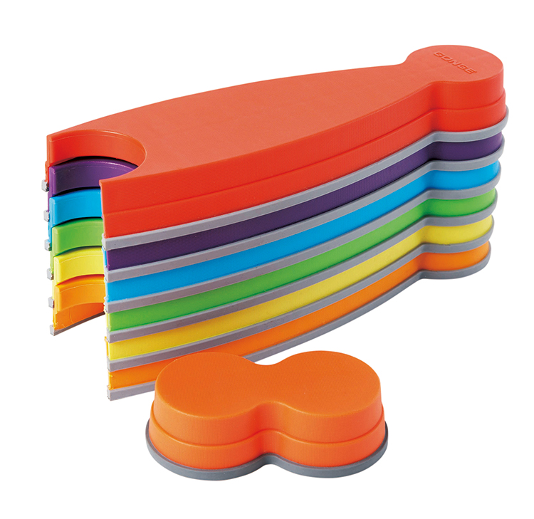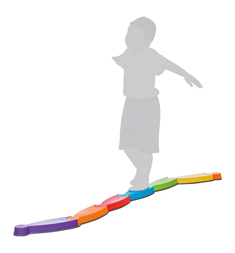 パーツをつなげると床上平均台になります。つなぎ部分を支点にして左右に動かせるので、クネクネにしたり、まっすぐにしたり自由自在です。重ねてコンパクトに収納できます。裏面に滑り止めの加工付