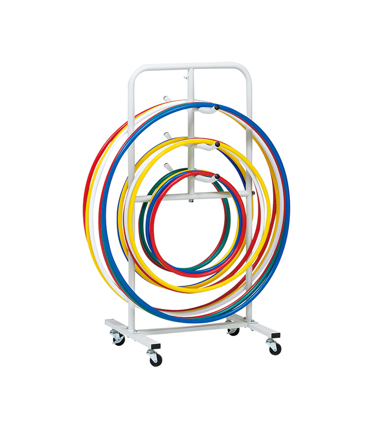大きさの異なる体操リングをコンパクトに収納できます。キャスター&ストッパー付。体操リング片側各段10本収納可能。