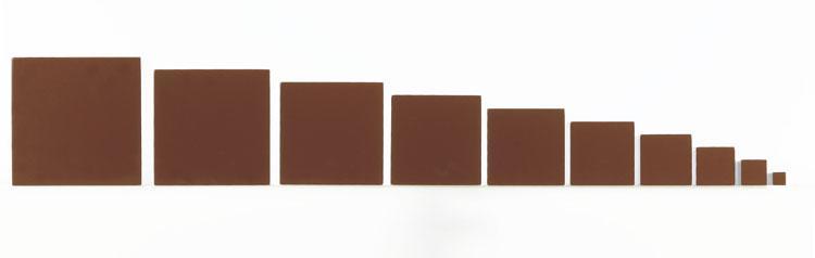 茶色に塗られた10本の木製の角柱です。長さはすべて20cmで、太さの1辺が1cmから10cmまで1cmずつ変化します。断面の正方形の縦・横の2つが変化する2次元の教具です。大きさが変化する正方形の面が、子どもによく見えるような向きで行うようにします。