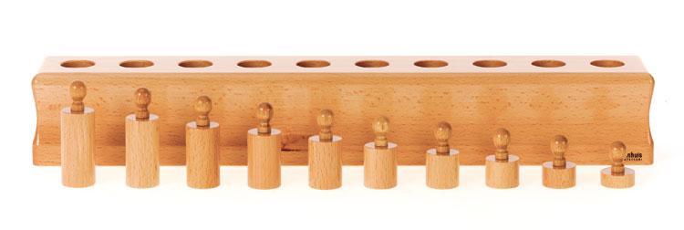 木製のブロックにつまみの付いた、大きさの違う10本の円柱が納まっています。それぞれの円柱の寸法は規則的に段階付けされていて、1つのブロックの特定の穴には1つの円柱しか入らないようになっています。円柱を正しい穴にはめこむ動作や、円柱の大きさの変化を、並び替えなどによって理解していきます。