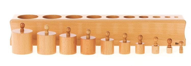 木製のブロックにつまみの付いた、大きさの違う10本の円柱が納まっています。それぞれの円柱の寸法は規則的に段階付けされていて、1つのブロックの特定の穴には1つの円柱しか入らないようになっています。円柱を正しい穴にはめこむ動作や、円柱の大きさの変化を、並び替えなどによって理解していきます。