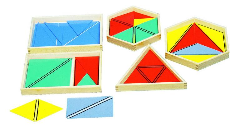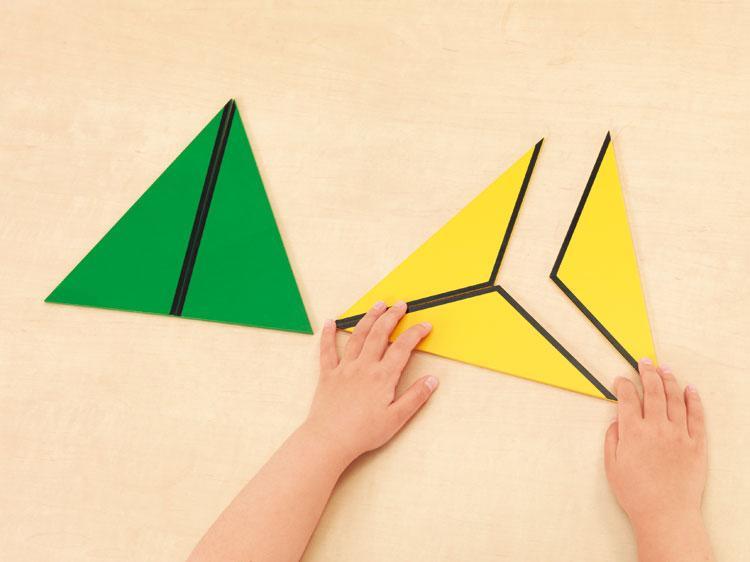 いろいろな色と形の木製の三角形のプレートのセットです。三角形の黒線同士を合わせて、さまざまな形の図形を作ります。