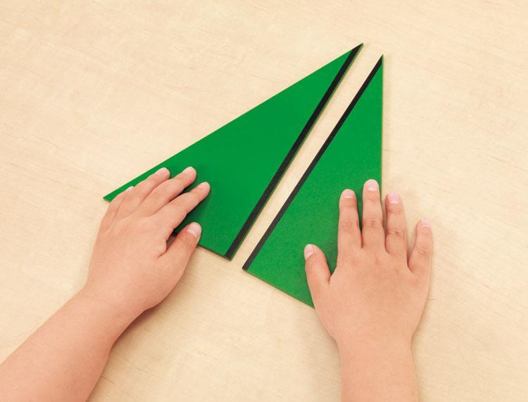 三角形を組み合わせることで、四角形をはじめ、いろいろな図形が作れることを知る。図形の等価(形は違っても面積が同じであること)を感覚的に知る。