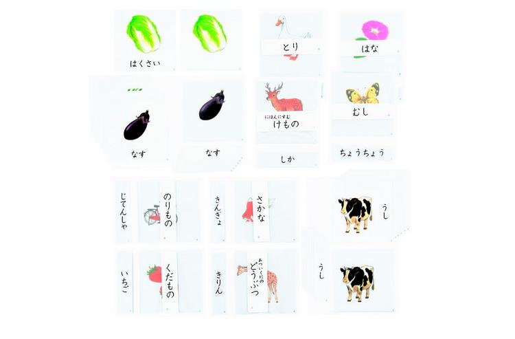 絵カードを見ながら、絵の内容(言葉)を確認します。初めて出会う言葉は覚えます。また絵合わせや、文字カード合わせにより、文字への関心をを育みます。「実物合わせ」の後に行います。