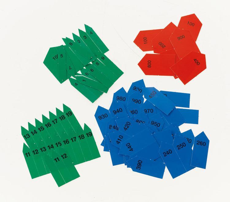 60-22483-128100と1000の数量を具体的に示すことができる鎖状のビーズです。色ごとの矢印カードを10や20といった、区切りになるビーズの横に置いて行きます。