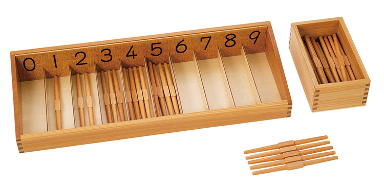 1本ずつバラバラになった棒を束ねることによって、量としての数を認識できます。「紡錘棒の仕切り箱」には、0のスペースがあり、「なにもない」=0の概念を視覚からも理解できるようになっています。