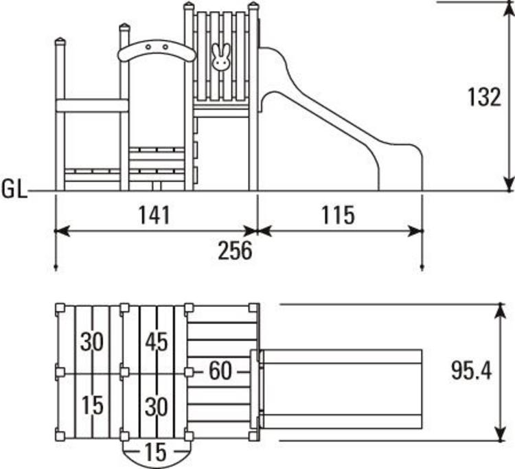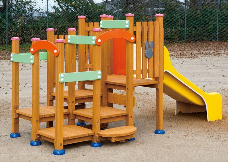 乳幼児を安心して遊ばせられる木製遊具で、ステップを登っていく道は幾通りもあります。頑張って上がれば、楽しい滑り台が待っています