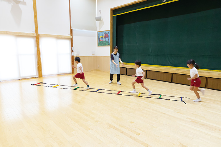 歩幅をだんだん広くしたラダーです。歩幅を広げながら走っていくことで、自然な加速の感覚が遊びながらつかめます。ステップは柔らかいので踏んでしまっても空気が抜けるだけで安全です。今までより速く走れるようになることで自己肯定感を高めます。