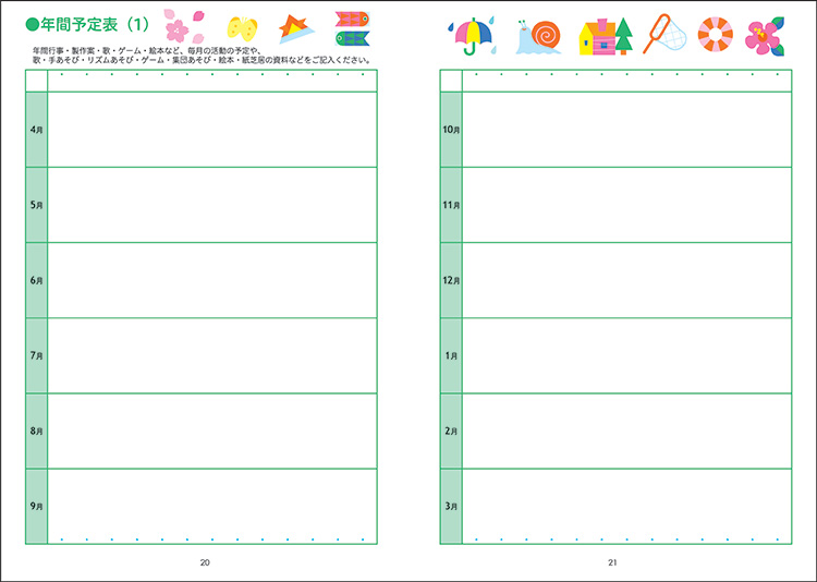 月間カレンダーの始まりは1月、週間カレンダーは4月です。保育に役立つ情報ページが充実しています。