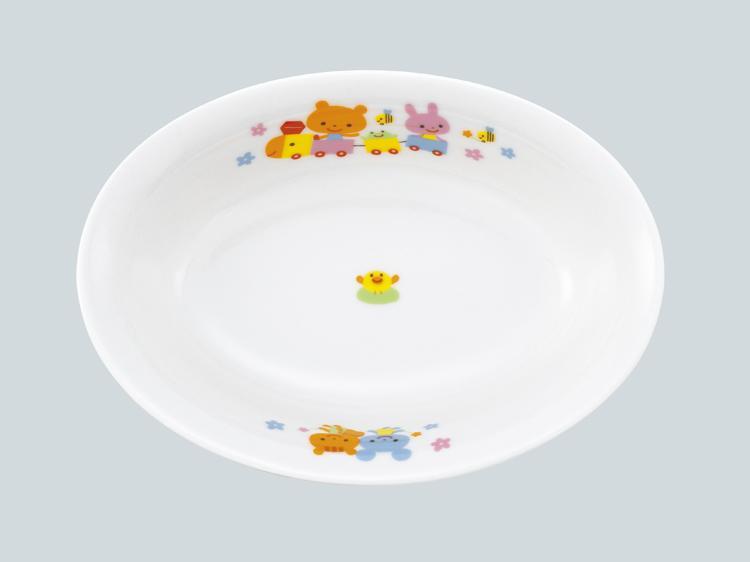 子どもが食べるのにちょうどよい大きさのカレー皿です。おしゃれな楕円形にかわいいイラストが入っています。化粧ケース入
