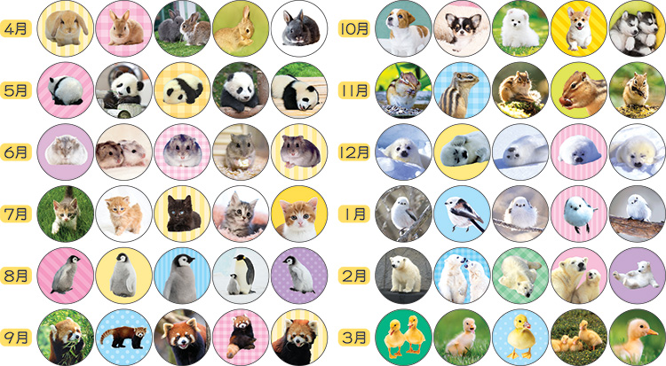 切り離せるシールです。おたよりF・G・Hにも使える大きさです。各月の出席シールの絵柄は5種類。一週間同じシールが貼れます。おやすみ・けっせきシールは別シートです。